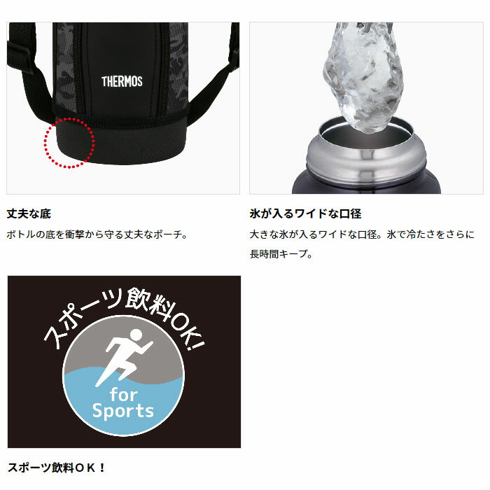 特徴飲みやすくなった新機構飲み口!空気穴を設けたので、飲み口がふさがれた状態でもゴクゴク飲めます!ポーチのストラップは肩にやさしい幅広タイプで長さの調整がしやすいアジャスターが2個付いています。