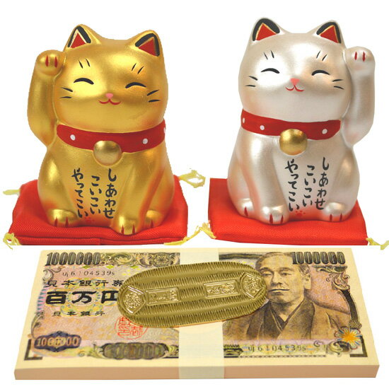 【送料無料】《日本の縁起物》◆招き猫◆100万円メモ帳&小判付き!NO-28 金銀夫婦招き猫 《右手左手一対招き猫》 ★ご利益★金運/財運/良縁/商売繁盛/家内安全/宝くじ