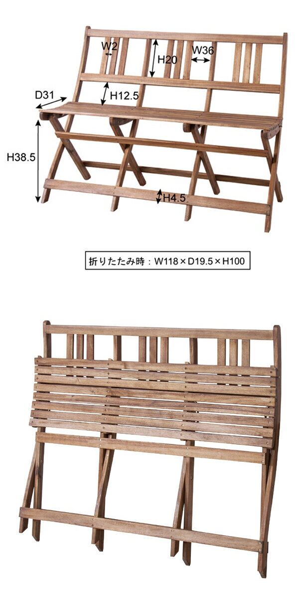 item spec サイズ ■本体:W=1,180×D=520×H=820mm ■座面の高さ:SH=450mm 材質 ■天然木(アカシア)・オイル仕上げ 色 ■ 商品説明 ■折り畳み式 ■完成品・原産国:ベトナム ■梱包サイズ:W=1,200×D=1020×H=120mm ■梱包重量:10kg チェア3脚が1つになったようなデザインのベンチチェア。